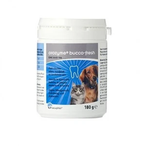 Orozyme Bucco-fresh is een voedingssupplement voor honden en katten ter voorkoming van een slechte adem, tandplak en tandsteen.